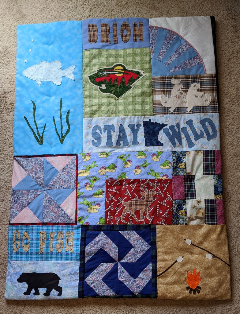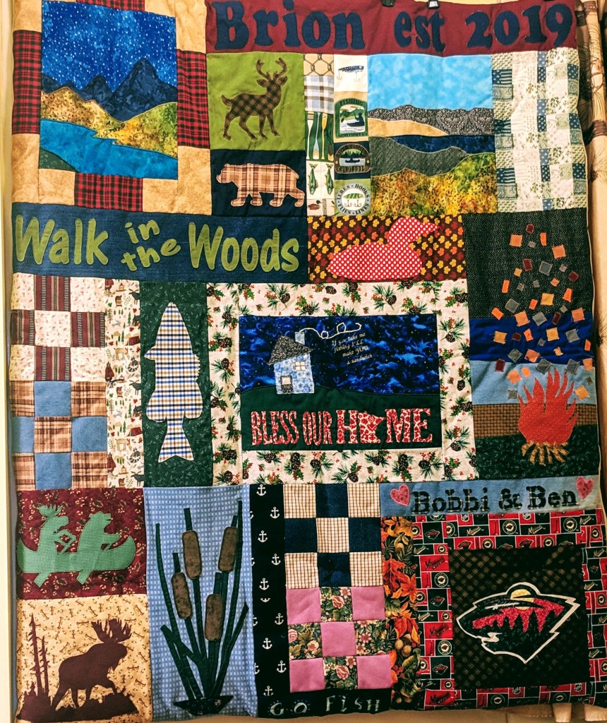 This memory quilt was made as a wedding gift. Many of the materials came from the bride’s grandparents’ clothes. Her grandmother was also a quilter and some of the fabrics were right out of her stash. The pictures represent the couple’s interests and hobbies.